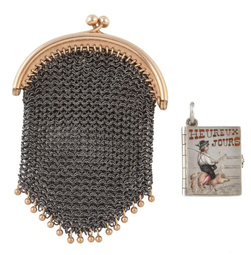 Conjunto de colgante de libro de plata con decoración esmaltada y monedero de malla pavonada con boquilla en oro bajo