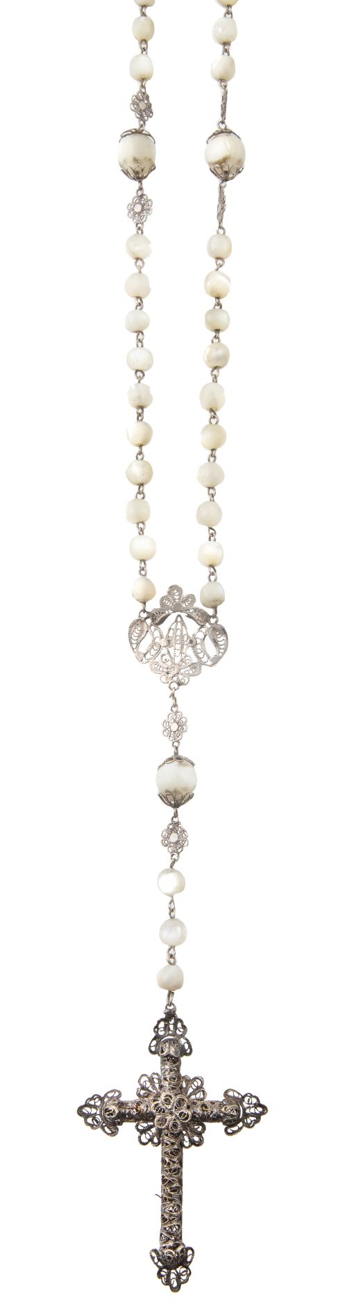 Rosario de pp. S. XX con cuentas de nácar y filigrana de plata