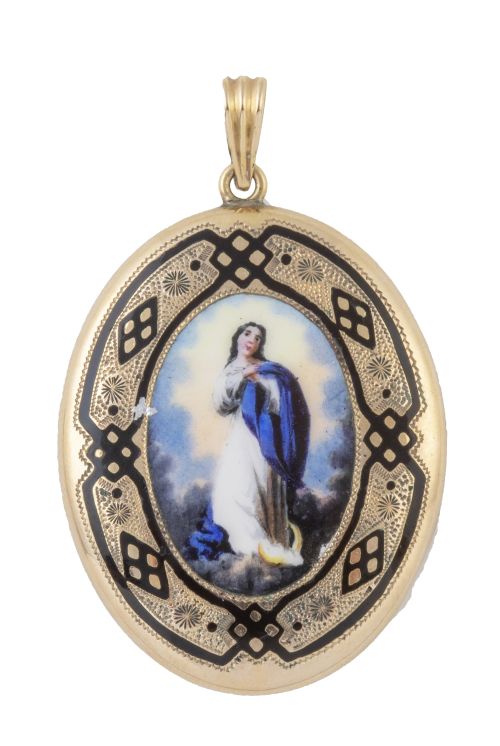 44. Colgante portafotos con esmalte de Virgen y reverso con decoración grabada