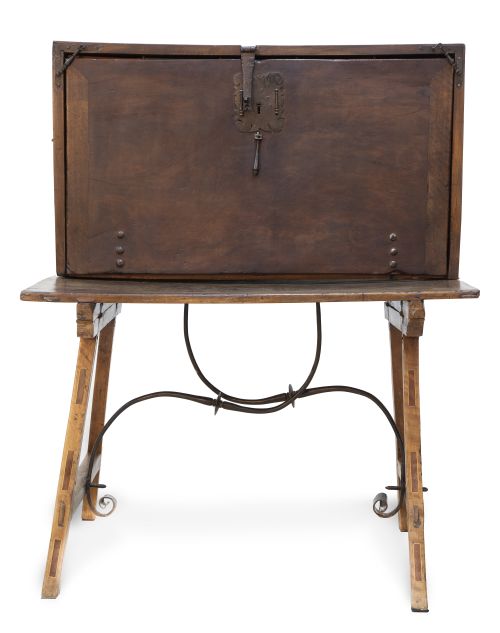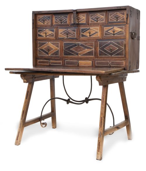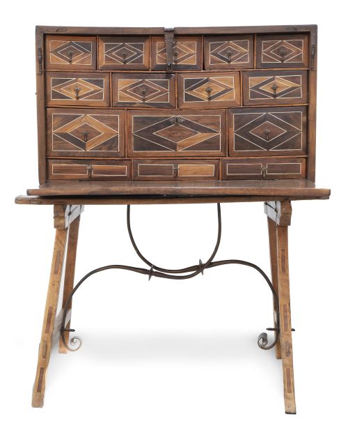 Frente con 15 cajones decorados con decoración romboidal, el exterior con cerradura de hierro recortado y asas de hierro a los lados. Apoya sobre mesa con patas en esviaje y decoración geométrica en las patas y en la tapa. Los fiadores de hierro de época posterior.