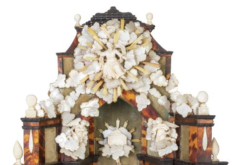 De forma arquitectónica sobre un zócalo, con unas escalinatas y figuras talladas de marfil en bulto redondo en adoración, la Virgen de rodillas en el altar. El altar con aplicaciones de hilos de plata, en la parte de arriba rematado por Dios Padre, sobre nubes de nácar y resplandores. Parte posterior de papel simulando mármol. Acompaña fanal.