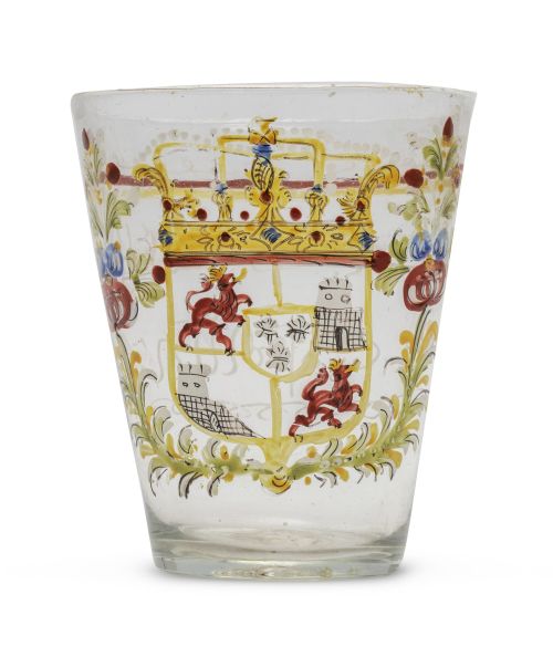 Home / SUBASTA DE OCTUBRE 2024 / Vaso de vidrio transparente esmaltado con colores, con leye