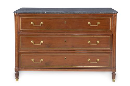 677. Cómoda escritorio Luis XVI de madera de caoba con tapa de mármol gris.