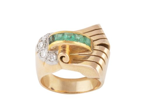 80. Sortija chevalière con diseño asimétrico decorada con banda de esmeraldas calibradas y brillantes