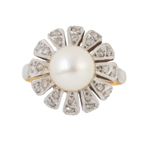 Sortija flor años 50 con perla central rodeada de pétalos de diamantes