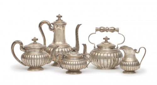 Decoración gallonada, con hojas grabadas. Está formado por: samovar, cafetera, lechera, azucarero y tetera.