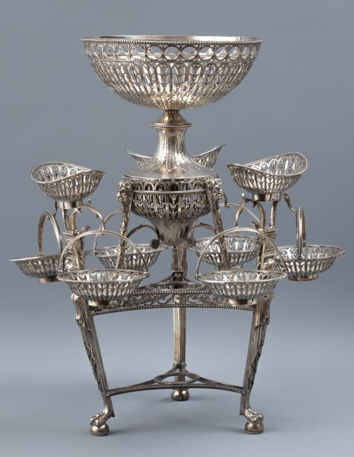 "Epergne" Jorge III de plata cincelada, calada y moldeada, decorados con contarios, hojas y meandros curvos. Con marcas. marcas del platero IY.