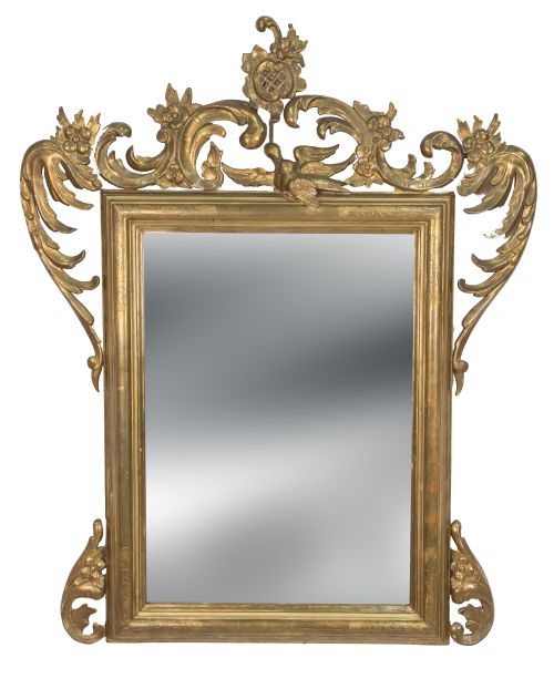 Espejo de madera tallada y dorada con copete rematado por aves y flores.