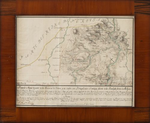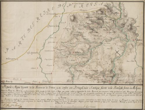 Inscrito: "Pequeño Mapa departe de la Provincia de Orense y su confin con Portugal, desde el antiguo fuerte dela Bandeja frente á Melgazo, hasta la Plaza de Monterey, con demostración delos parajes de dicho confin Ó Vaya, que para cubrir y resguardar la dicha Provincia por esta parte delas ymvasiones delos Portugueses fronterizos, combndra restablecer y Ocupar con Paysanaje armado, y sostenido de alguna tropa, en los terminos que declara el escrito que acompaña; previniendo que aunque las situaciones delos puntos principales no ban sujetas á Geometricas Operaciones, lo están ala estima de distancias, que respectivamente tienen entresi, por un reconocimeinto expreso hecho por Yngenieros capazes, y seguras noticias delos del pays, Practicos de él y de dicha vaya=. /Que para no equibocar la situación deOrense en este pequeño Mapa comparativamente á Otros, deve quien lo mirare contemplarse en dicho Orense, buelta la Cara à Portugal, en cuyo caso tendra à su derecha el Miño, y por consiguiente la Coruña y Provincia de S. Trago, a su frente la Bandeja, Megazo, y mas avajo Valencia y Tuy, y asu Izquierda Montereyu, y quatro leguas de esta Plaza la de Chaves"/ leguas comunes".