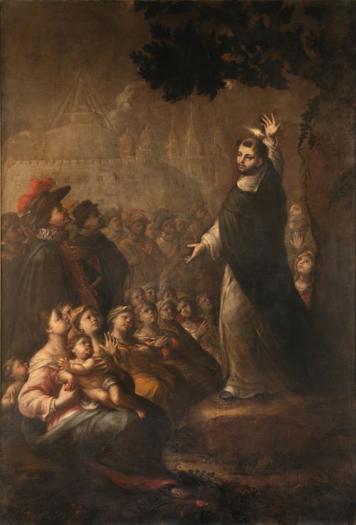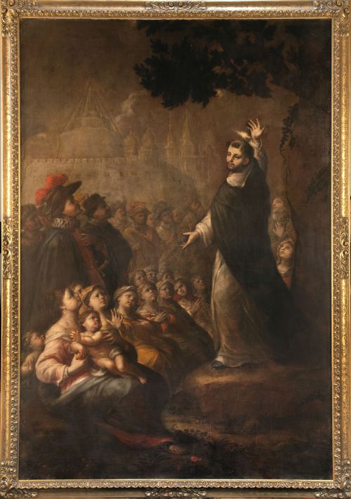 La obra que presentamos, firmada por Alonso del Arco, representa la predicación de Santo Domingo de Guzmán. La composición sigue un esquema clásico, repetido en numerosas ocasiones por distintos artistas, especialmente en escenas de predicación. En un paisaje con la vista de una ciudad amurallada, con torres y cúpulas de aspecto ficticio, se sitúa a la derecha la figura del santo, en un lugar elevado, predicando bajo las ramas de un árbol. A sus pies, un grupo de mujeres lo escucha atentamente, destacando entre ellas una madre con un niño en brazos. En un segundo plano, se observa a un grupo de caballeros, entre los cuales sobresale una pareja con sombreros, uno de ellos adornado con plumas, todos centrados en la predicación del santo.
