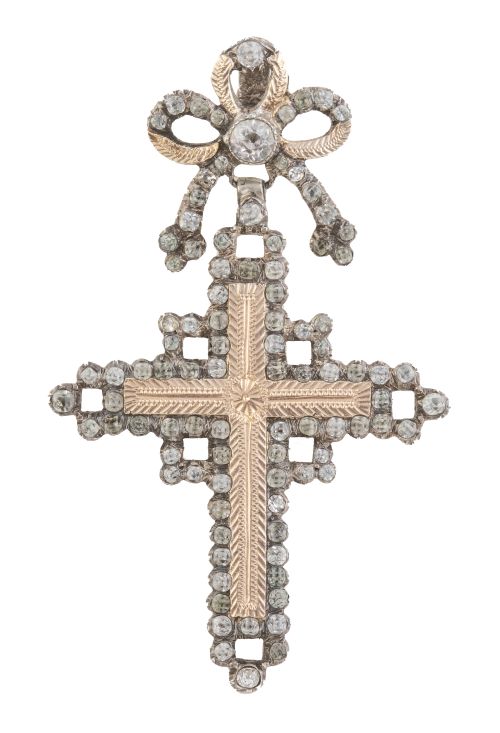 1. Cruz colgante S. XVIII de plata y strass con frente de oro bajo, que pende de lazo superior