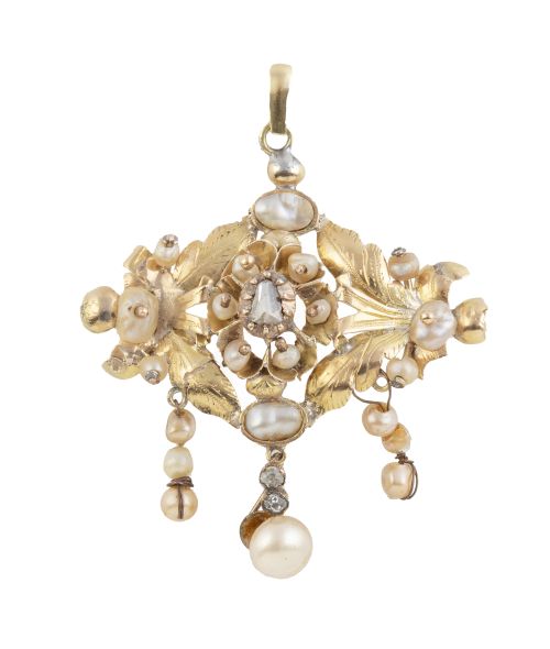 Home / SUBASTA DICIEMBRE 2024 / Colgante S. XIX con flores de perlas de aljofar y diamante