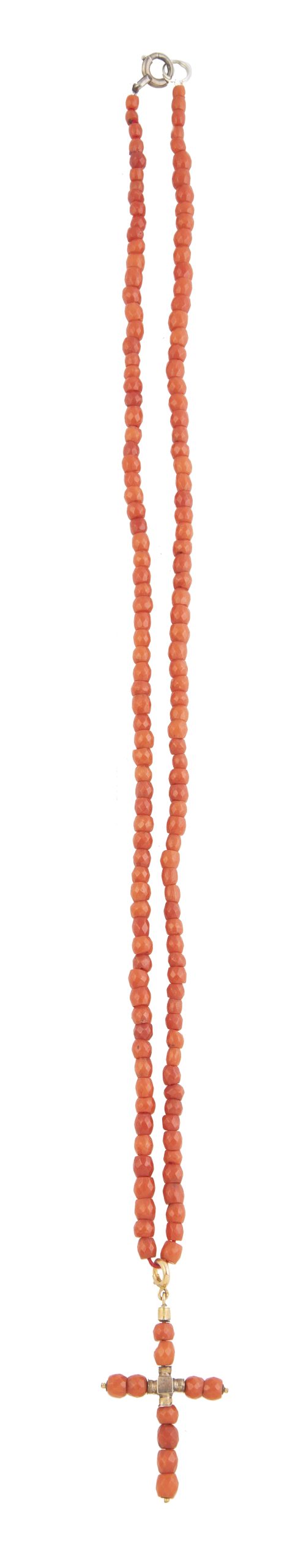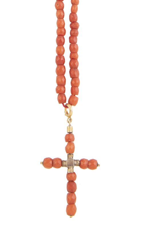 24. Collar largo S. XIX de coral facetado con cruz colgante