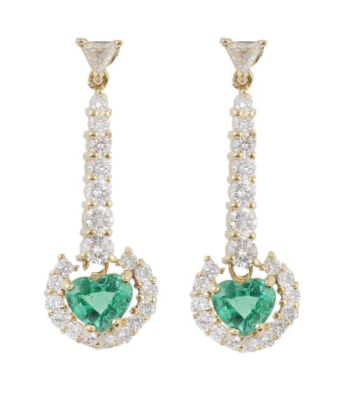 254. Pendientes largos de esmeraldas talla corazón que pende de línea de brillantes y diamante talla triángulo superior