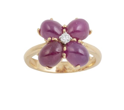 272. Sortija flor con centro de brillante y cuatro pétalos de cabuchón de rubíes