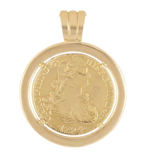 273. Colgante con reproducción de moneda de 8 escudos Carlos IV len marco de oro liso
