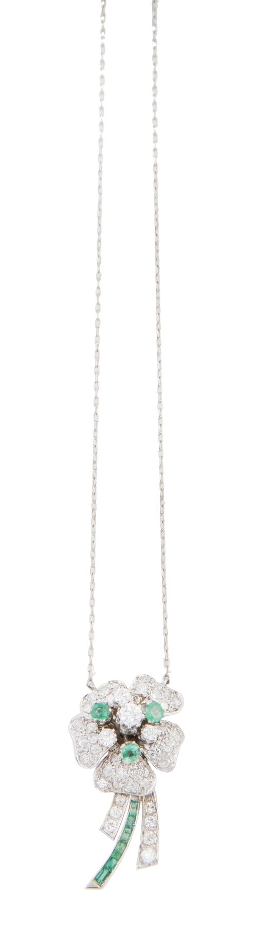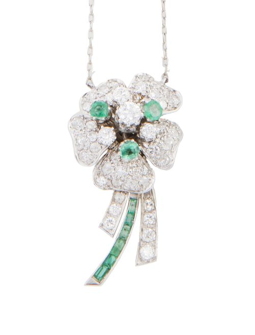 Pendentif flor años 30 de brillantes y esmeraldas con cadena fina