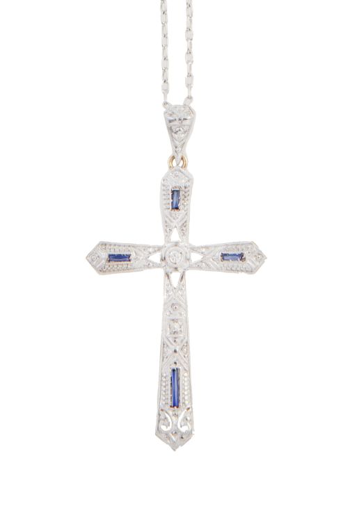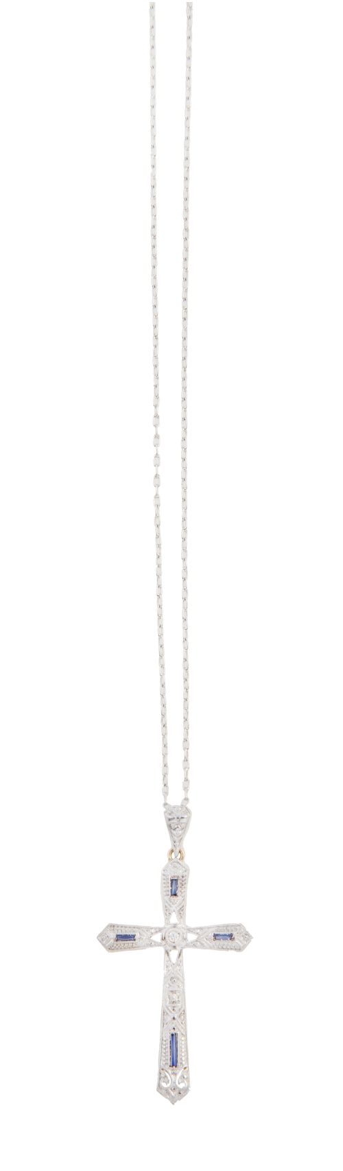 Cruz colgante Art-Decó de brillantes y zafiros talla baguette, con cadena fina