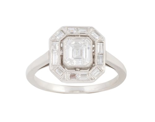 Sortija octogonal con brillante central talla esmeralda de 0,90 ct aprox y marco de brillantes talla baguette