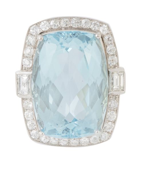 Sortija estilo Art-Decó con aguamarina oval facetada, en marco rectangular de brillantes flanqueada por baguettes