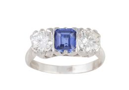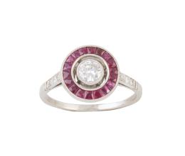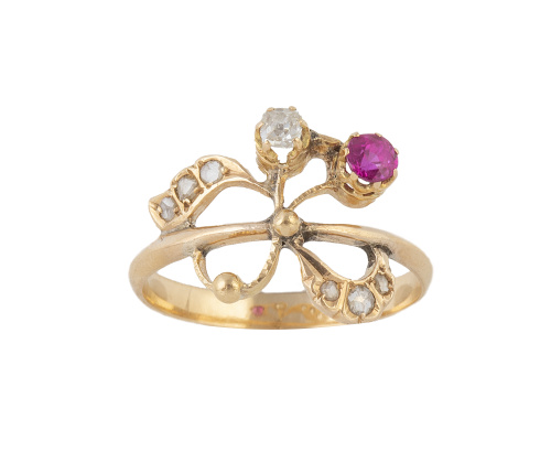 54. Sortija con frente asimétrico de motivos vegetales con brillante y rubí como flores centrales