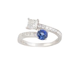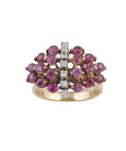 Sortija con frente asimétrico de motivos vegetales con brillante y rubí como flores centrales