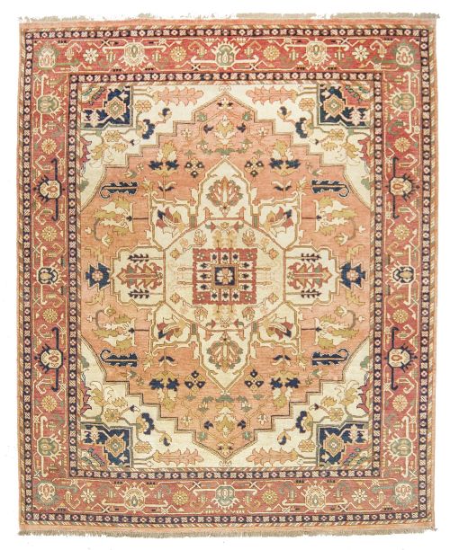 572. Alfombra en lana con campo beige y salmón y cartela central.