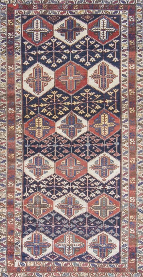 579. Alfombra caucásica con elementos geométricos, con campo azul y rojo.