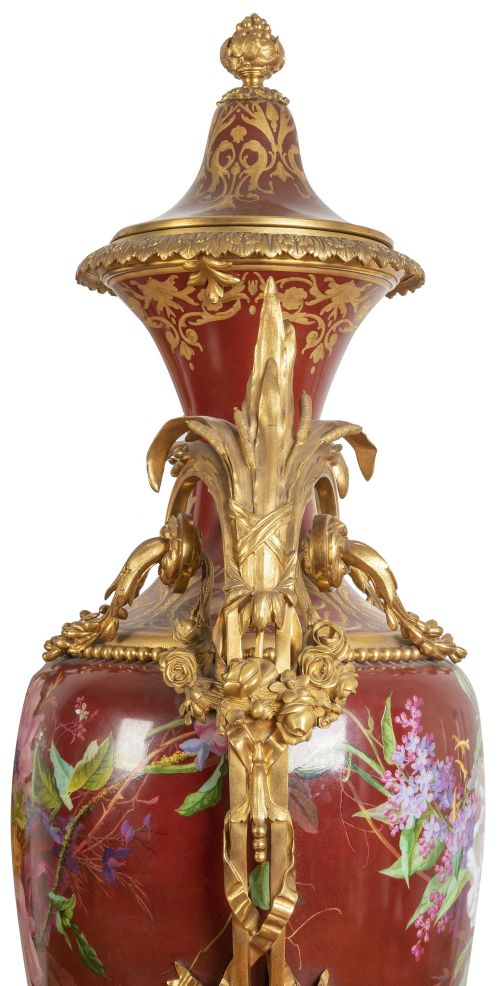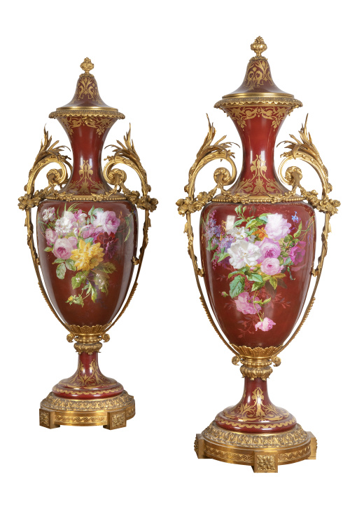 Pareja de jarrones de estilo Luis XVI, de opalina de fondo rojo con flores pintadas y bronces cincelados y dorados. Con un sello* en cada una de las tapas.