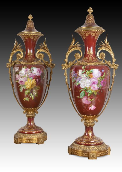 En el Museo d' Orsay de París se conserva una pareja igual a los jarrones que presentamos (núm. de inventario GML 3636 1 y 2), aunque con algunas diferencias en las asas y en las flores, pintados por Emile Belet.