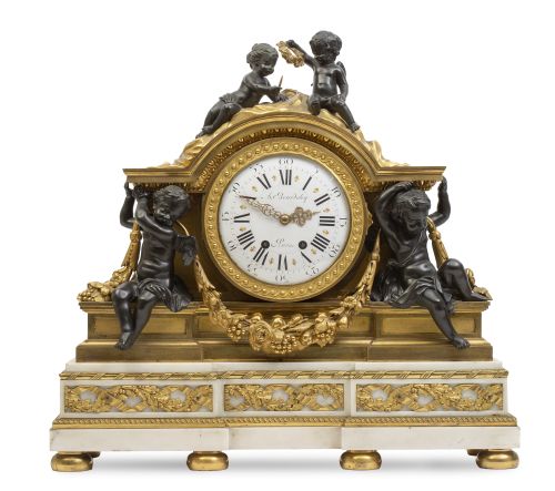 Plinto de mármol blanco sobre patas, decorado con cenefa entrelazada de bronce dorado con bellotas y hojas de roble. La esfera del reloj con numeración romana alternando flores de lis entre los números, flanqueada por dos puttis que sostienen una guirnalda de flores y la parte superior del reloj, rematada por dos puttis más, uno escribiendo y otro levantando la mano con una corona de flores. Con maquinaria París.
