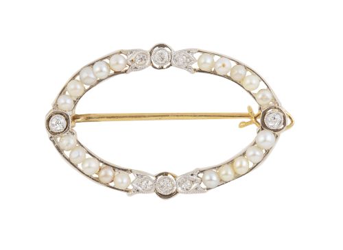61. Broche oval Belle-Époque de perlitas finas y brillantes de talla antigua decorando puntos cardinales