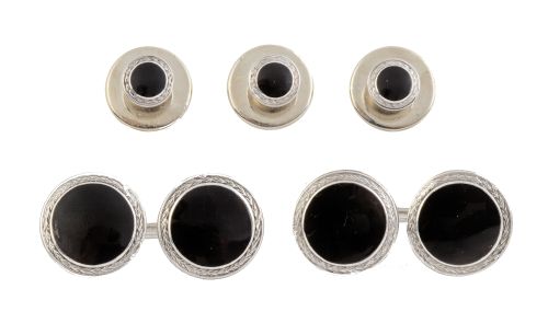 Botonadura Art-Decó compuesta por gemelos circulares y tres botones de esmalte negro con marco de espigas