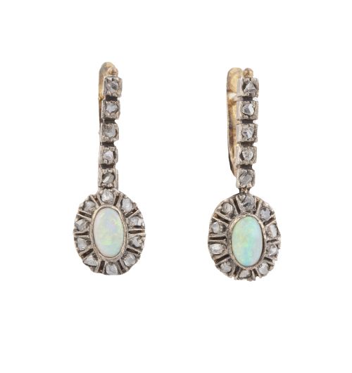 77. Pendientes largos S. XIX portugueses, con rosetón colgante de ópalo oval orlado de diamantes que pende de barrita de diamantes