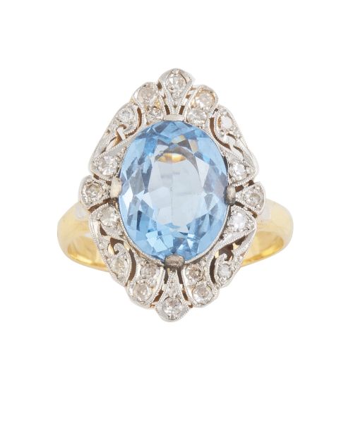 80. Sortija lanzadera Art-Decó con piedra azul oval central y marco de diamantes