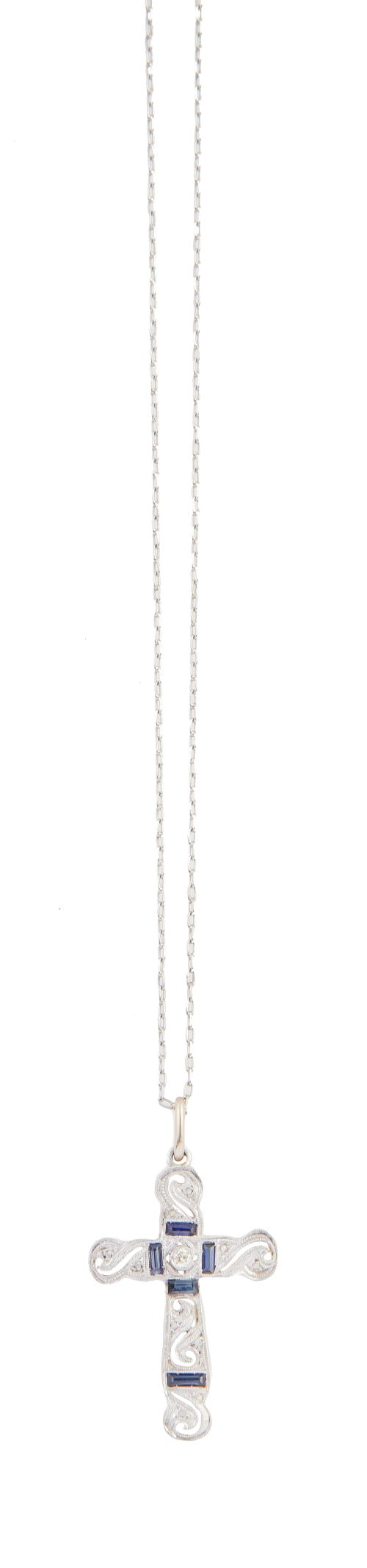 85. Cruz colgante Art-Decó de diamantes zafiros talla baguette, con cadena de platino