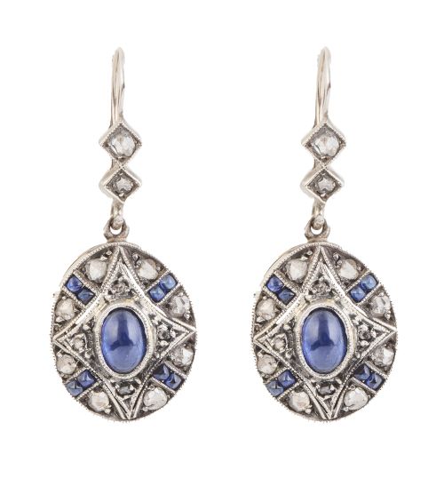 Pendientes largos Art-Decó de diamantes y zafiros con ovalos colgantes decorados con cabuchón de zafiro y aspas de diamantes y zafiros calibrados
