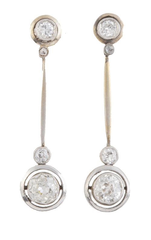 97. Pendientes largos Art-Decó con chatón de brillante que pende de barrita y chatónes de brillante de menor tamaño