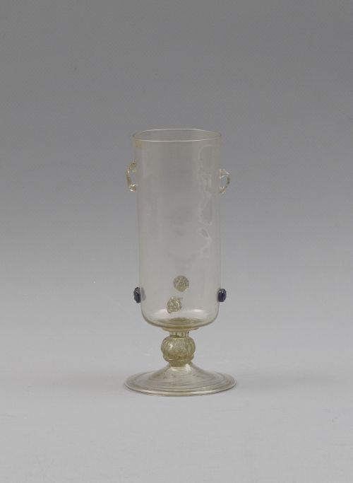 1039. Copa de vidrio ámbar y con decoración de cabujones en azul y asas.