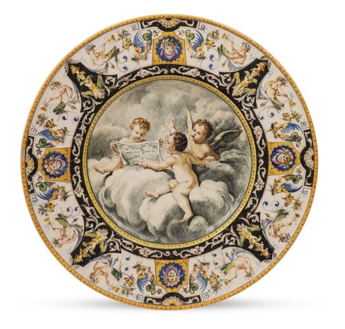 Plato historicista de cerámica esmaltada con tres puttis, siguiendo modelos del S. XVI.