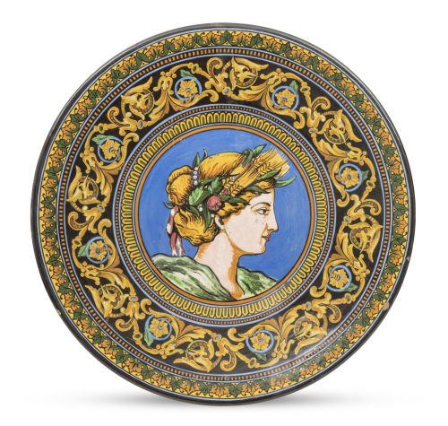 Plato de cerámica esmaltada con una alegoría de perfil, con cenefa de hojas de acanto.