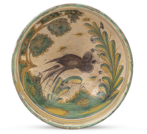 Cuenco de cerámica esmaltada con ave y árboles en el asiento de la serie polícroma.
