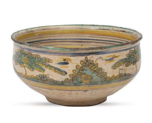 1069. Cuenco de cerámica esmaltada con ave y árboles en el asiento de la serie polícroma.