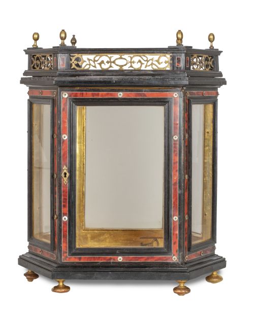 Escaparate Carlos II de madera ebonizada, dorada, carey y nácar.