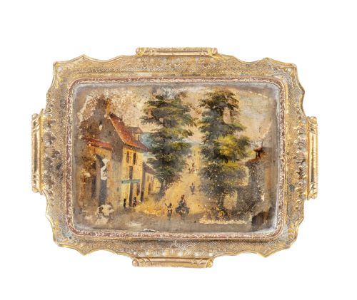 1. Broche S. XIX con paisaje centroeuropeo, con marco en oro bajo decorado con formas vegetales grabadas