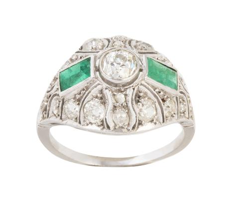 101. Sortija bombé Art-Decó con brillante central entre dos esmeraldas, en montura cuajada de brillantes de talla antigua en trabajo calado
