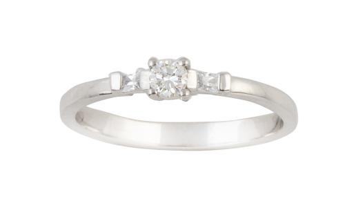 Sortija con brillante central flanqueado por dos diamantes de talla rectangular