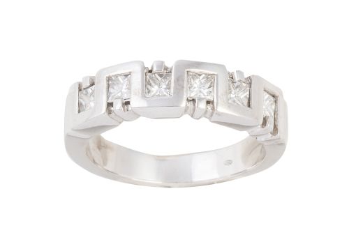 Sortija con diseño de greca cuadrada en zig-zag con brillantes talla cuadrada en sus centros