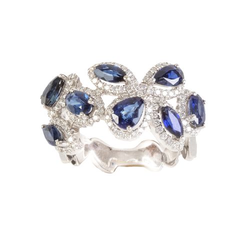Sortija con zafiros talla perilla y navette orlados de brillantes, a modo de hojitas que componen doble banda frontal