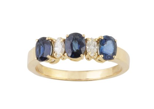 Sortija con tres zafiros talla oval alternos con diamantes talla navette